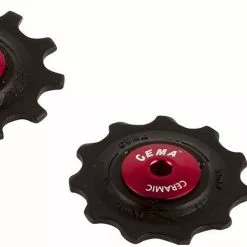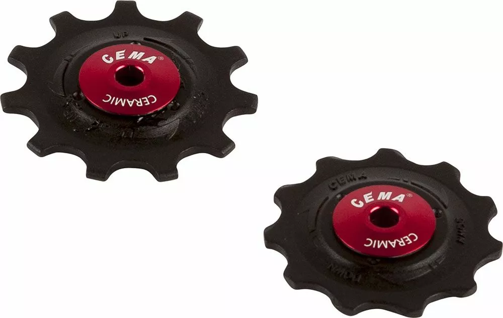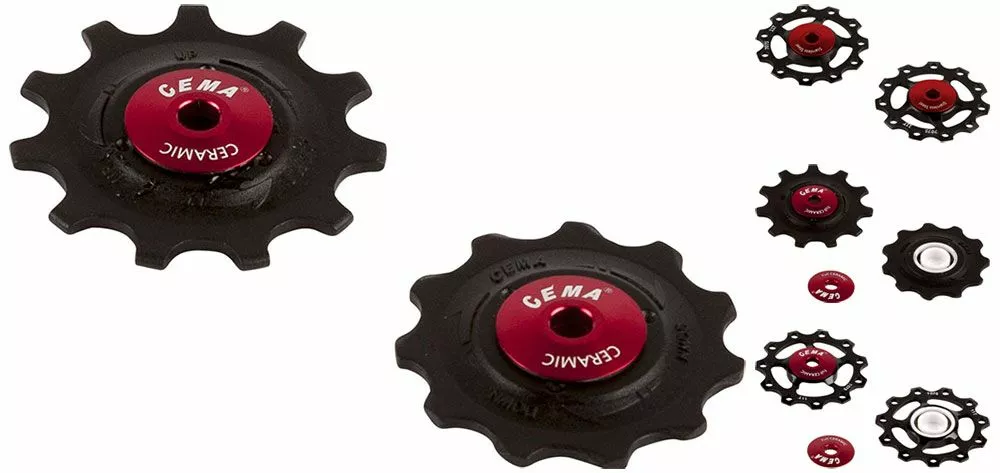 Juego de poleas de recambio Cema para desviadores Shimano de 9-/10-/11 velocidades y SRAM de 10-/11 velocidades. Dependiendo de la versión, las ruedas de polea tienen un cuerpo de aluminio o de plástico reforzado con carbono y están equipadas con un rodamiento de cerámica SRC, de cerámica completa o de acero inoxidable.