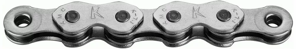 La cadena K1 Narrow Singlespeed de KMC con superficie niquelada para BMX, sistema de engranajes de buje y otros sistemas de una sola velocidad que requieren una transmisión directa de la potencia.