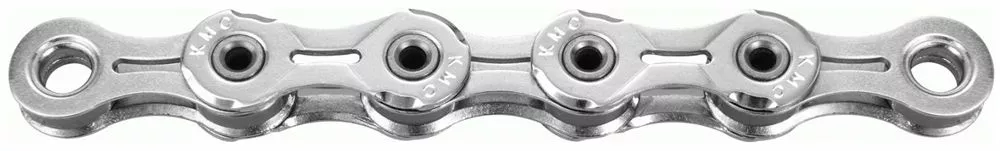 La cadena súper ligera X10SL de 10 velocidades de KMC sin dependencia del sentido de la marcha y con superficie niquelada para sistemas de cambio de 10 velocidades.