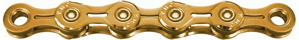 La cadena superligera X11EL Ti-N de 11 velocidades de KMC sin dependencia del sentido de la marcha y con un revestimiento superficial de oro de nitruro de titanio para sistemas de cambio de 11 velocidades.
