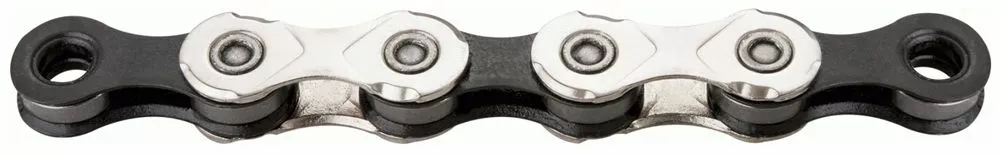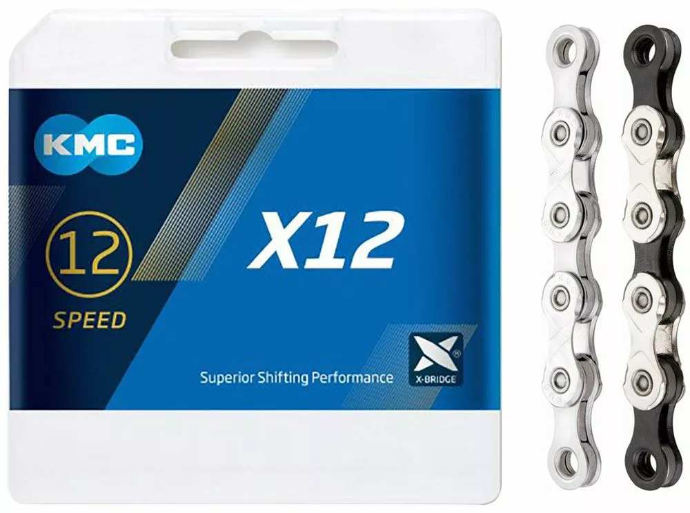 La cadena X12 de 12 velocidades de KMC, extremadamente duradera, sin dependencia del sentido de la marcha y con superficie niquelada para sistemas de cambio de 12 velocidades.