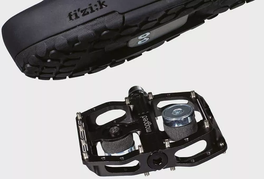 - Tracción: La zapatilla se sujeta magnéticamente al pedal con una fuerza de tracción de hasta 15 kg, dependiendo de la fuerza del imán seleccionada. La fuerza de tracción es principalmente vertical y la liberación lateral del pedal es posible sin casi ninguna resistencia perceptible. Sin embargo, el desprendimiento rápido y fácil directamente hacia arriba en situaciones críticas tampoco es un problema.