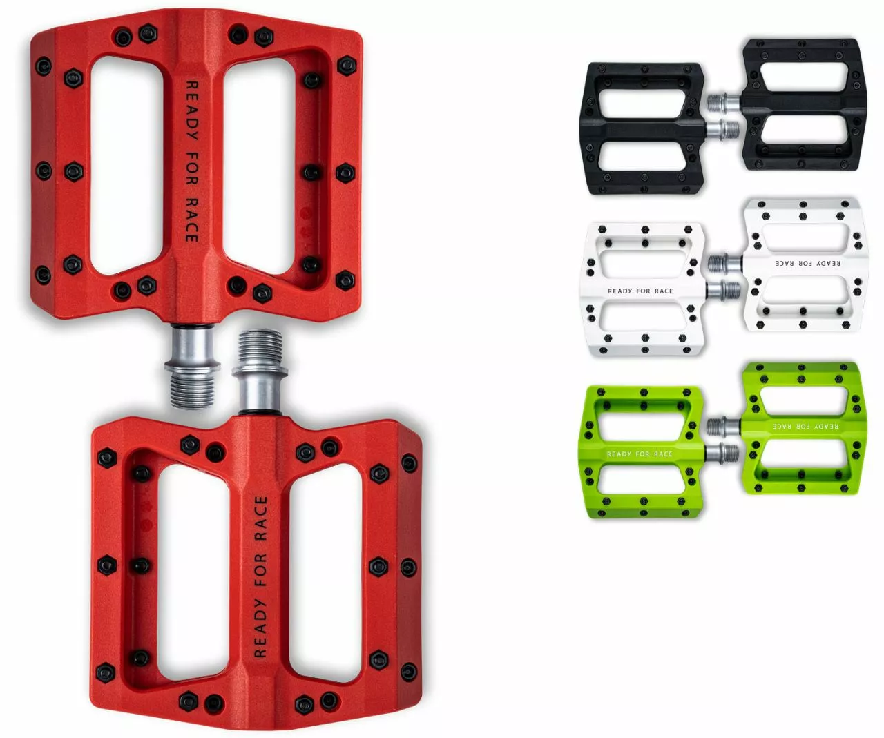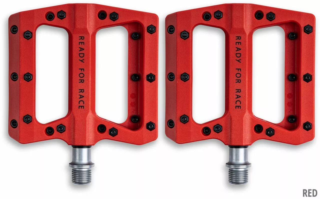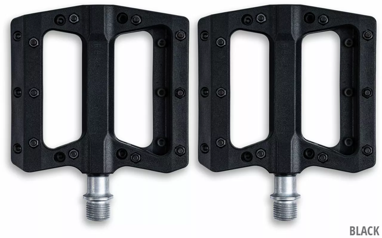 Pedal plano ETP ultraligero de RFR fabricado en termoplástico técnico que ofrece un agarre perfecto en condiciones de viento y clima gracias a las clavijas antideslizantes reemplazables. El eje de Cr-Mo fresado mediante CNC es extremadamente ligero y duradero.