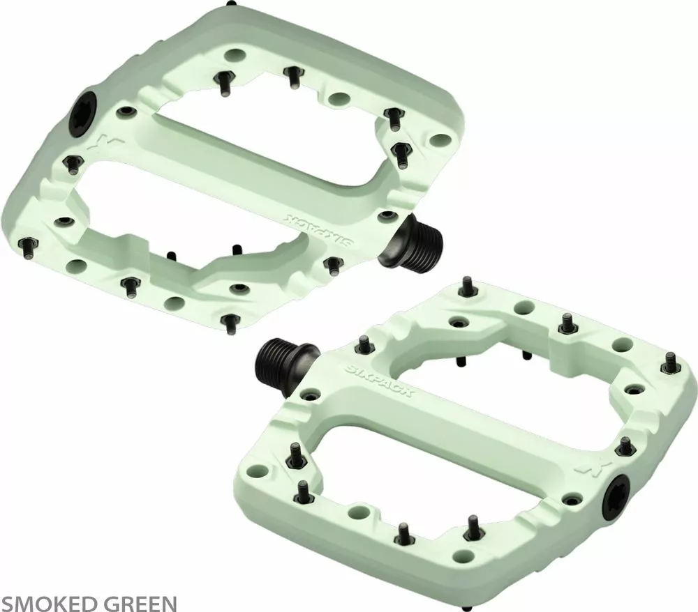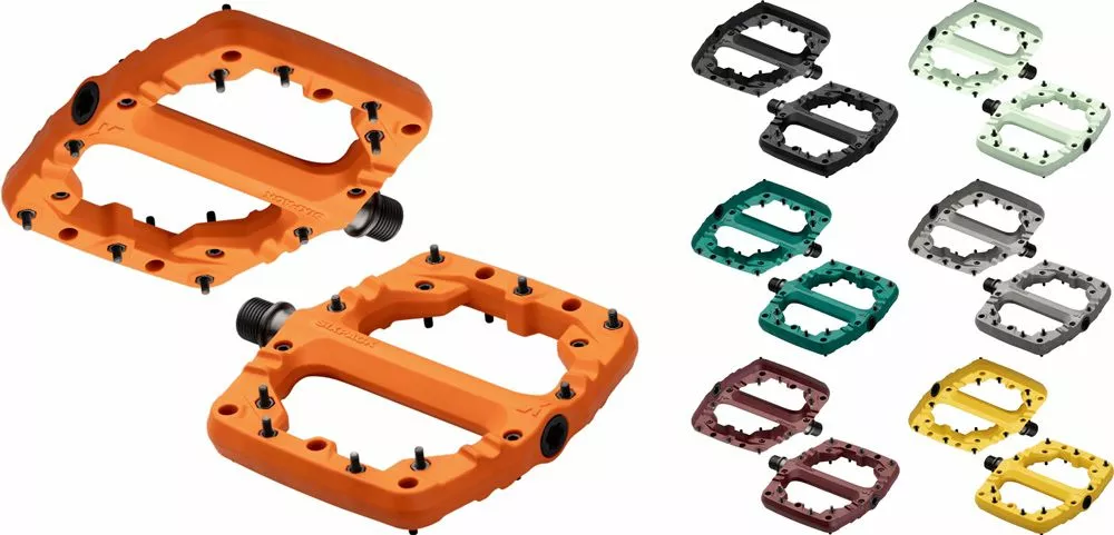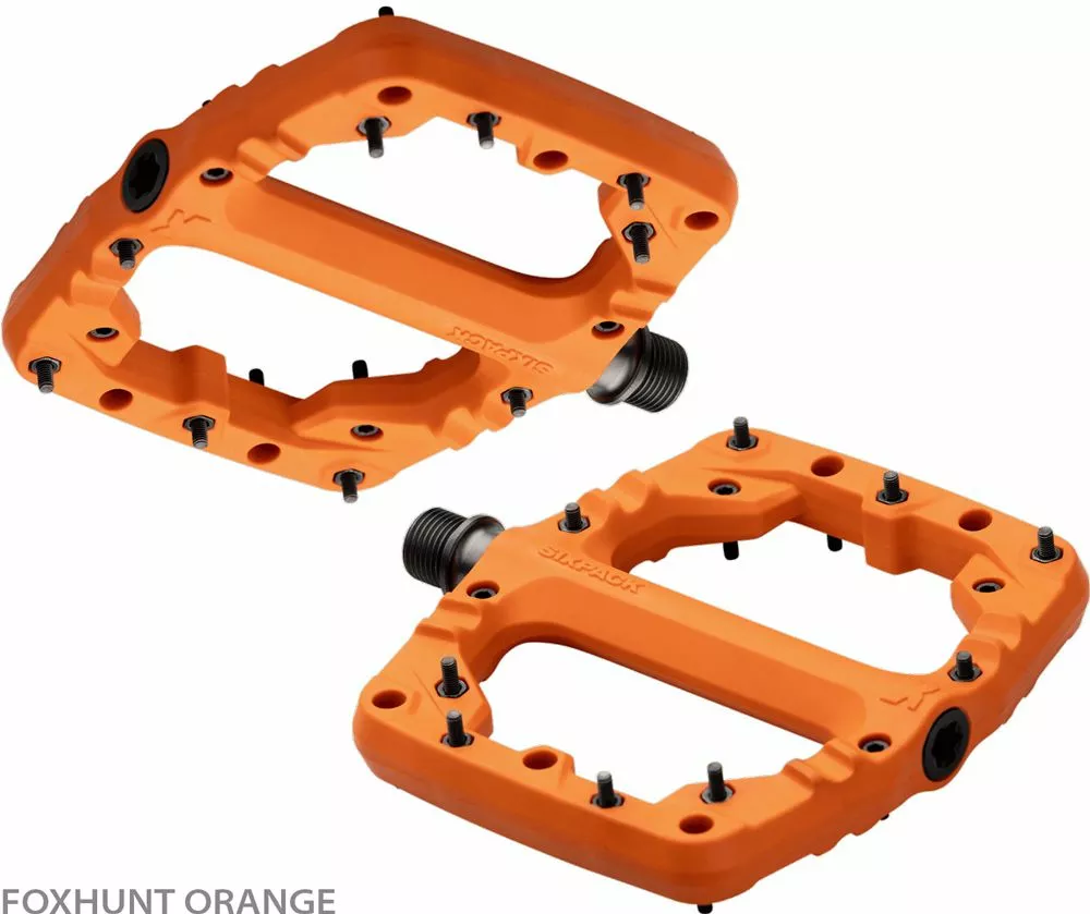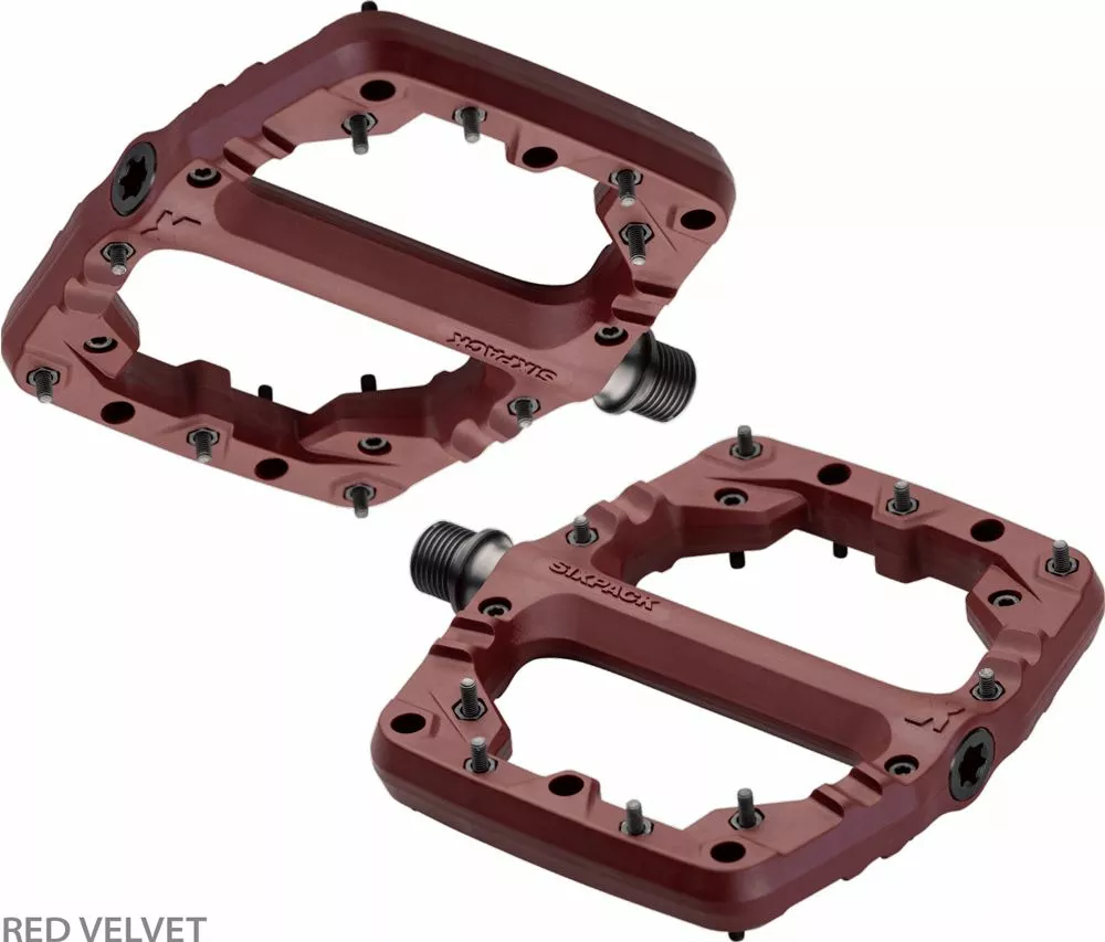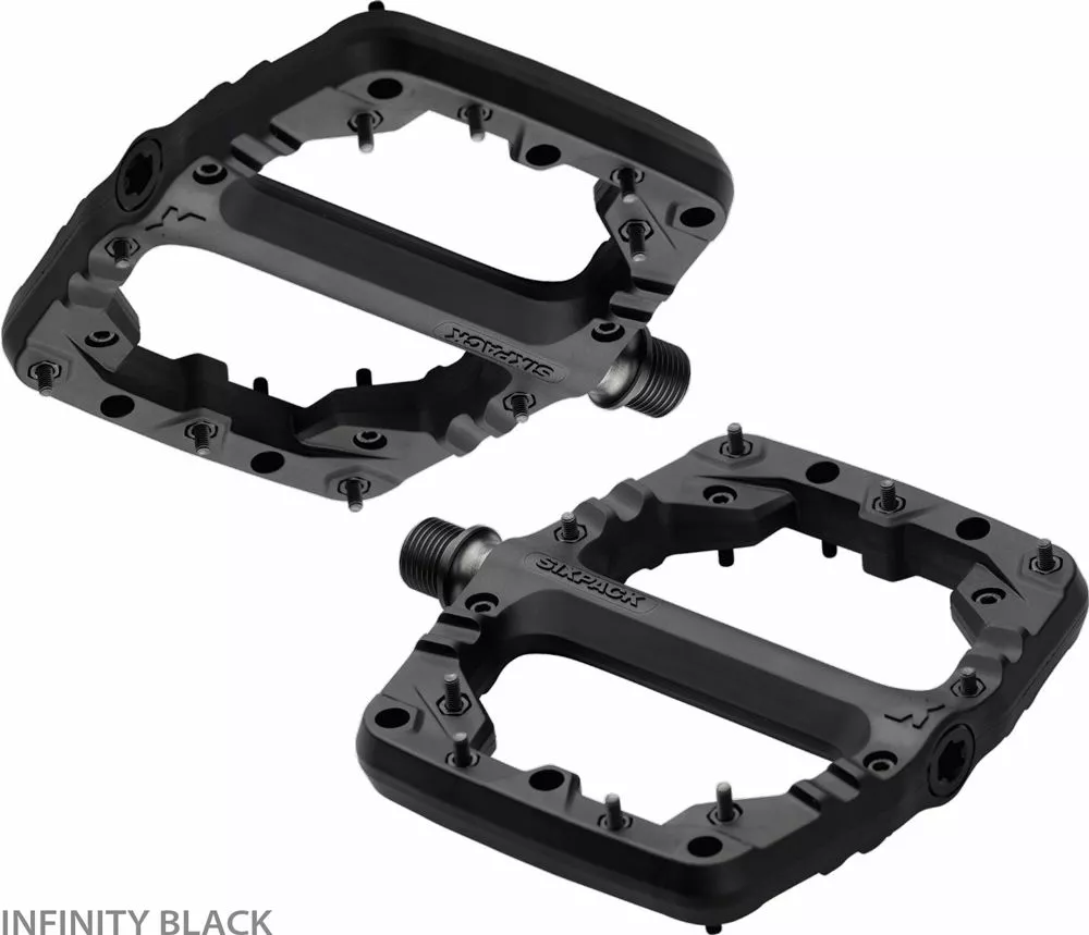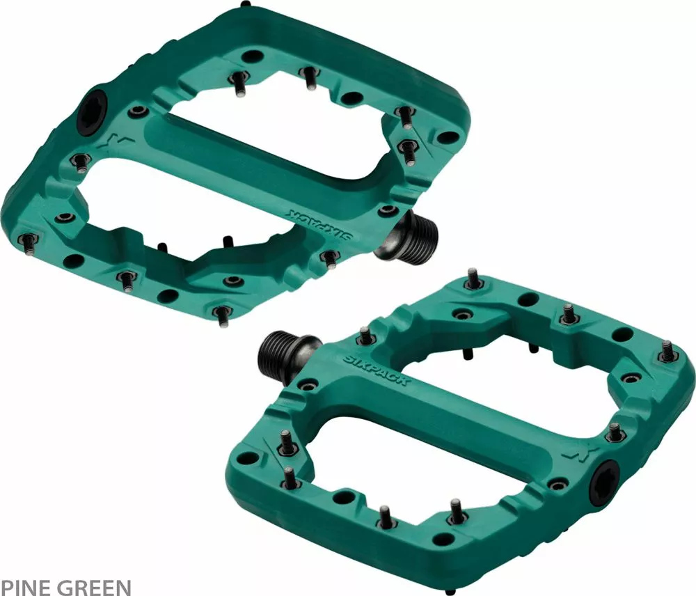 Los pedales de gravedad «Kamikaze PA» de Sixpack Racing tienen una gran huella con un perfil preformado y 18 pines de acero extra largos. El cuerpo del pedal de material compuesto está hecho de poliamida reforzada con fibra de vidrio y puede soportar cargas extremas.