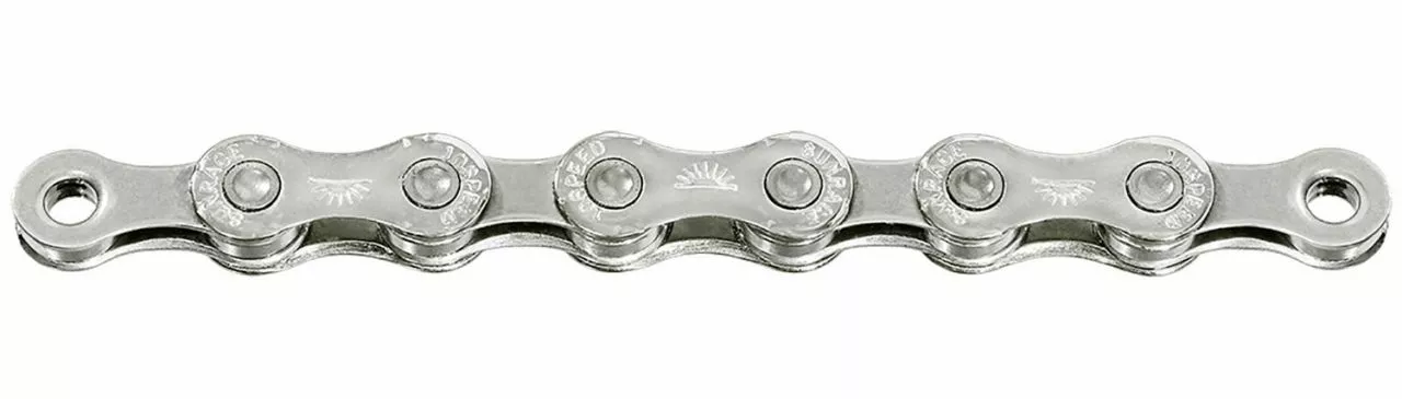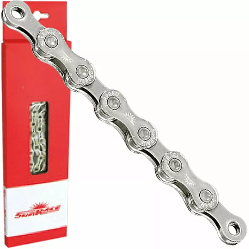 La duradera cadena SunRace CN10A de 10 velocidades con 116 eslabones para sistemas de cambio de 10 velocidades Sram/Shimano. Incluye candado de cadena Easy Link.