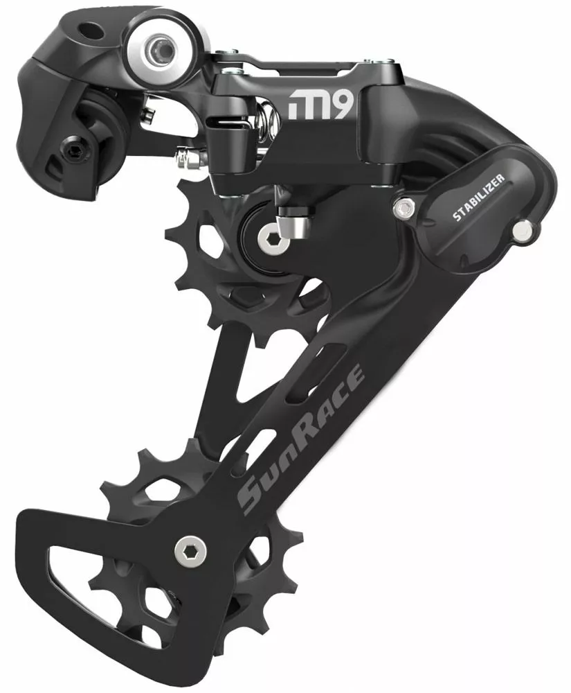 El desviador trasero SunRace RDM900 de 9 velocidades MD con estabilizador de cadena ajustable para reducir el movimiento de la cadena para una experiencia de conducción más silenciosa y estable. Compatible con los cambios SunRace y Shimano.
