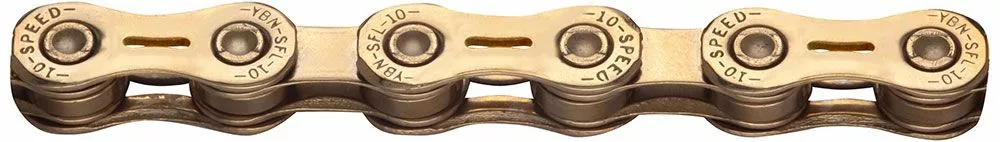La cadena YBN SLA H-10 TI-N Gold para desviadores de 10 velocidades es una cadena sólida y fácil de cambiar cuyo rendimiento también cumple con las altas exigencias.
